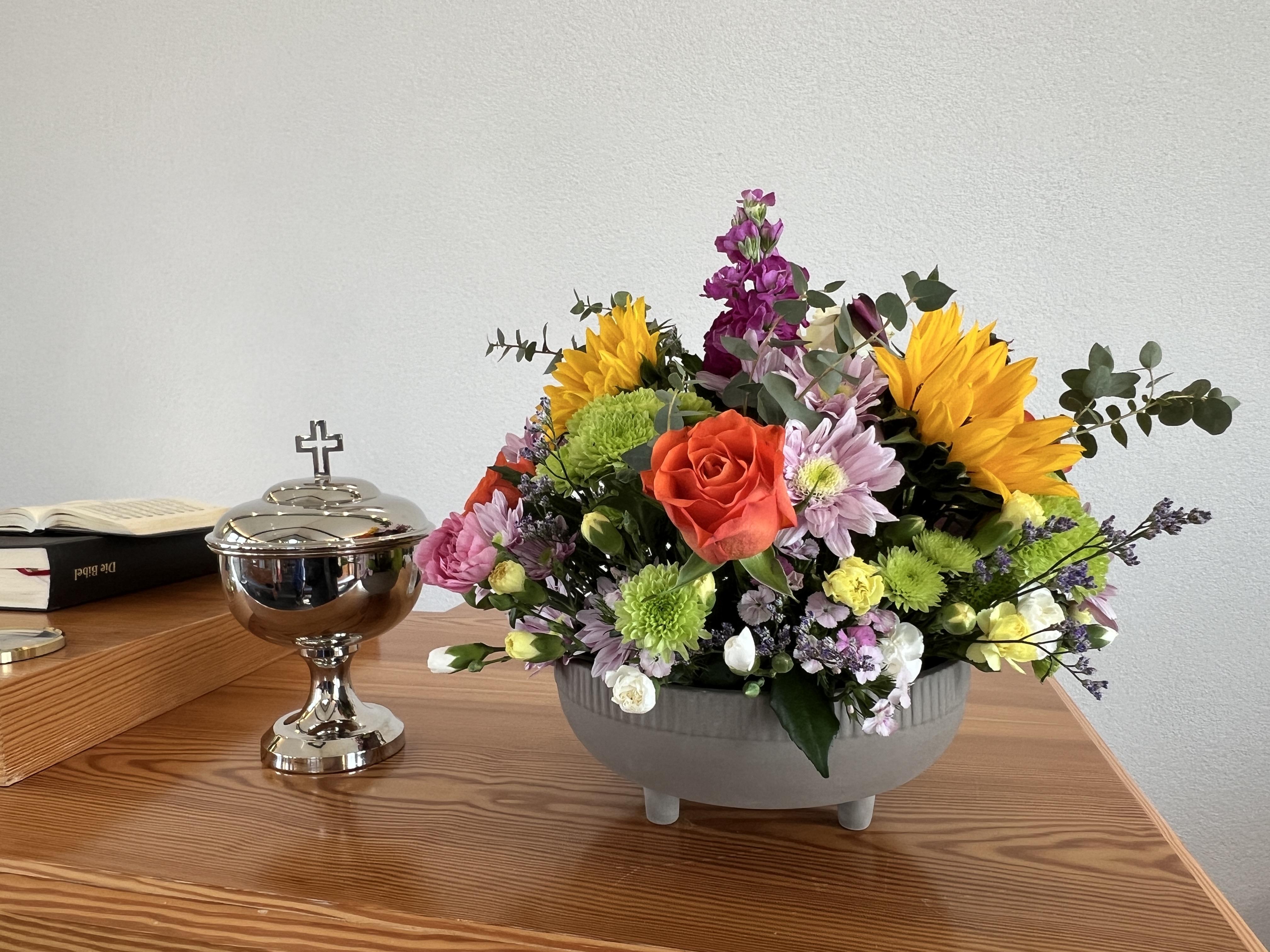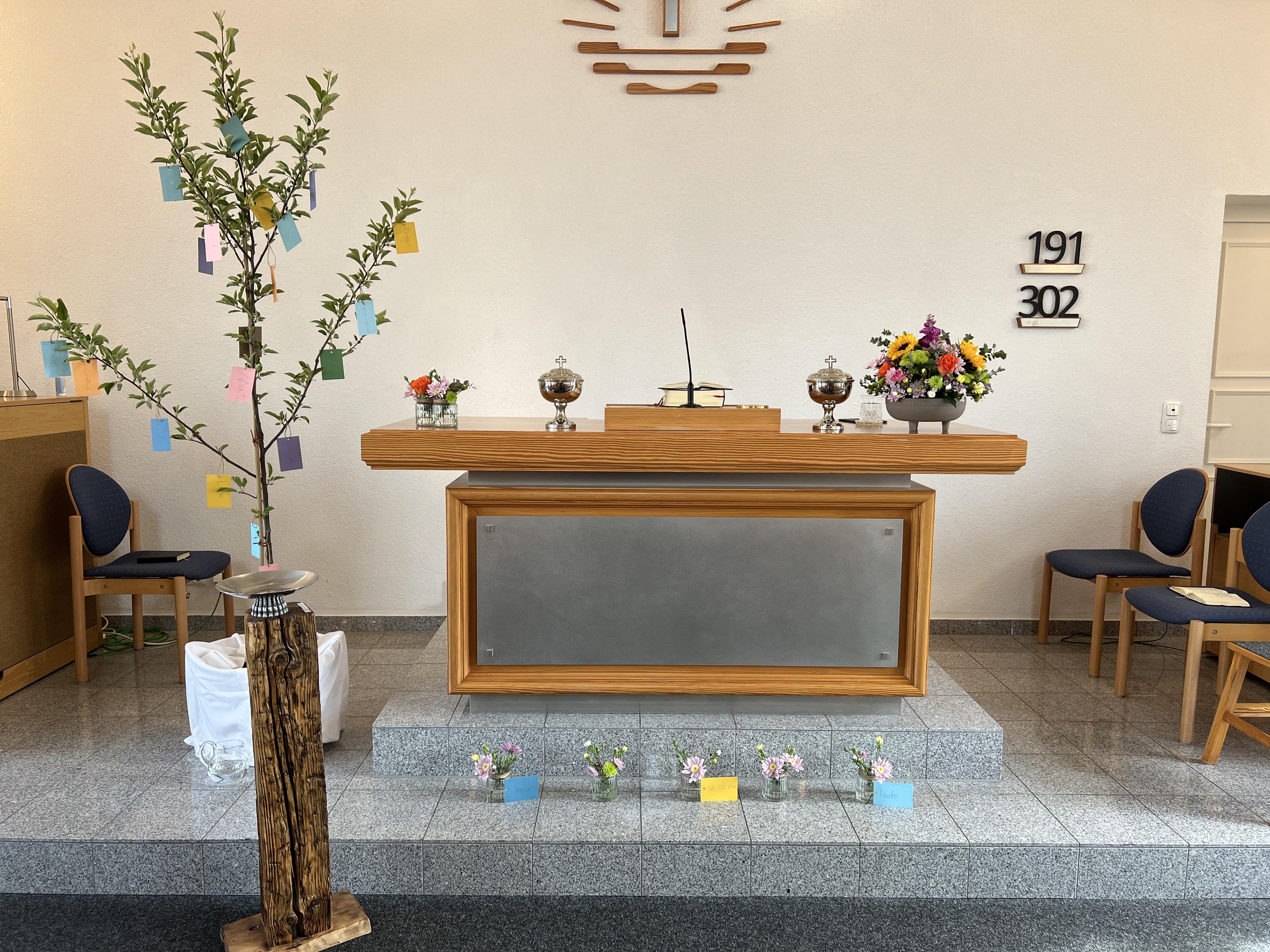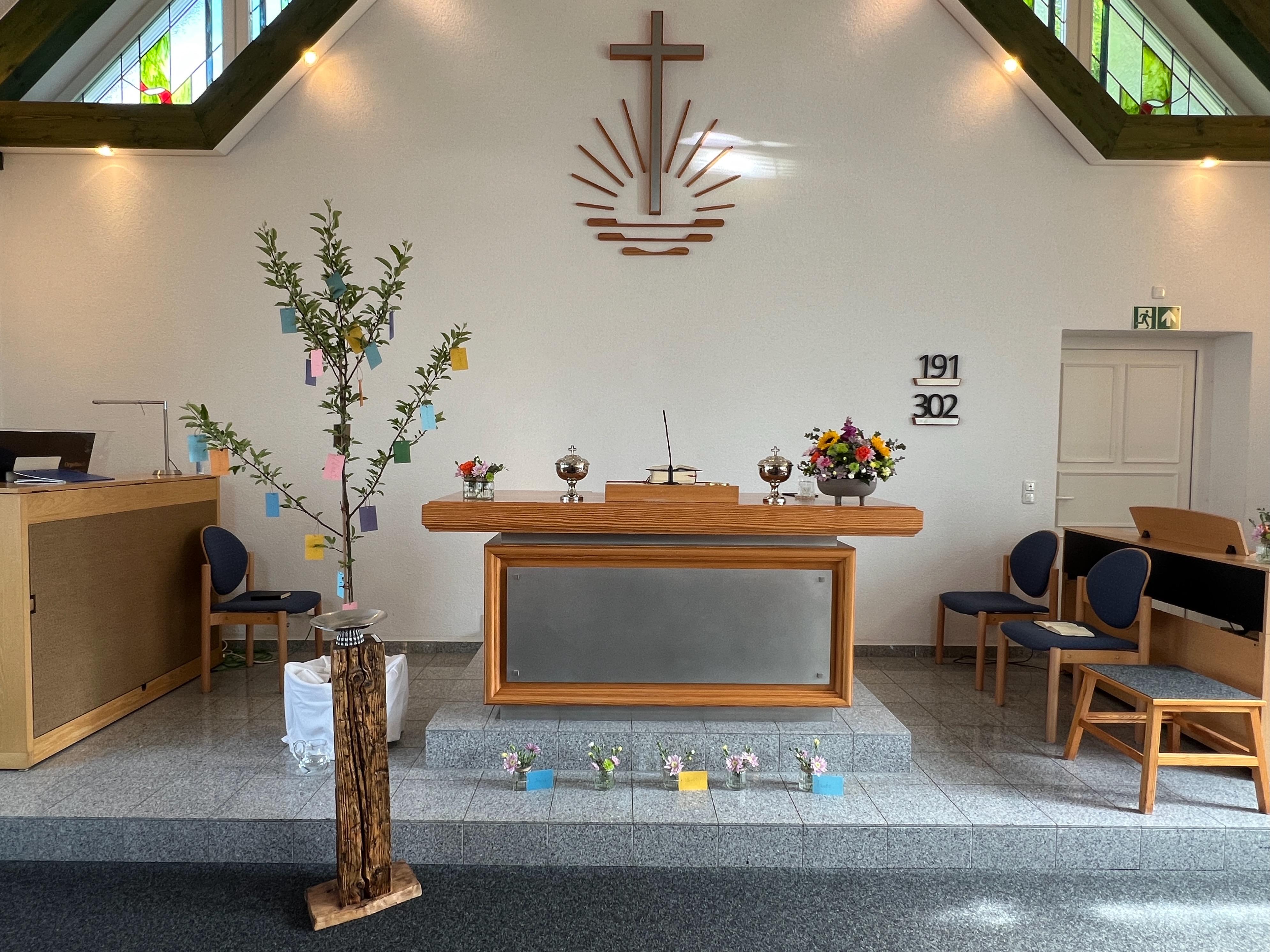 In der Co-Predigt sagte u. a. Diakon Gülzow, was der Name Janosch bedeutet: Gott ist gnädig, Gott ist gütig.Vor dem Altar steht ein Apfelbaum (s. Foto). Dort in den Ästen hängen kleine Zettel. Da konnte man z. B. lesen: Mut, Zuversicht, Liebe, etc.. Und zu dem Wort MUT gehört ein guter Lebenslauf. Mach´ dir deinen Lebenslauf. Den kann dir keiner mehr nehmen.