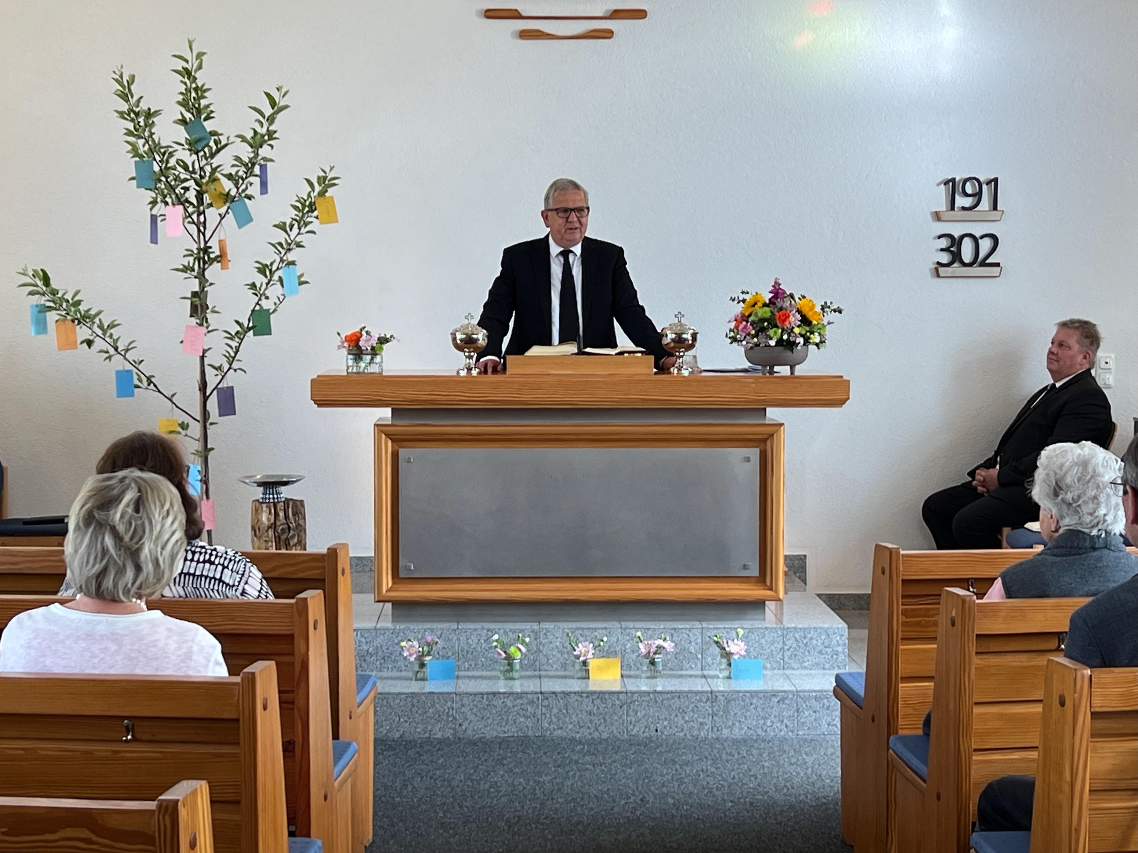 Nach dem Lied des Gemeindechores, „Das Gotteshaus ist unsre Lust und wird es immer mehr.“ (B382) spricht der Vorsteher zu Beginn der Predigt, dass es sich anscheinend auch ohne Gott auch gut leben lässt. Aber was kommt danach? Einfach ausgedrückt: die Erbsünde wird abgewaschen und der Mensch wird von Gott aufgenommen.