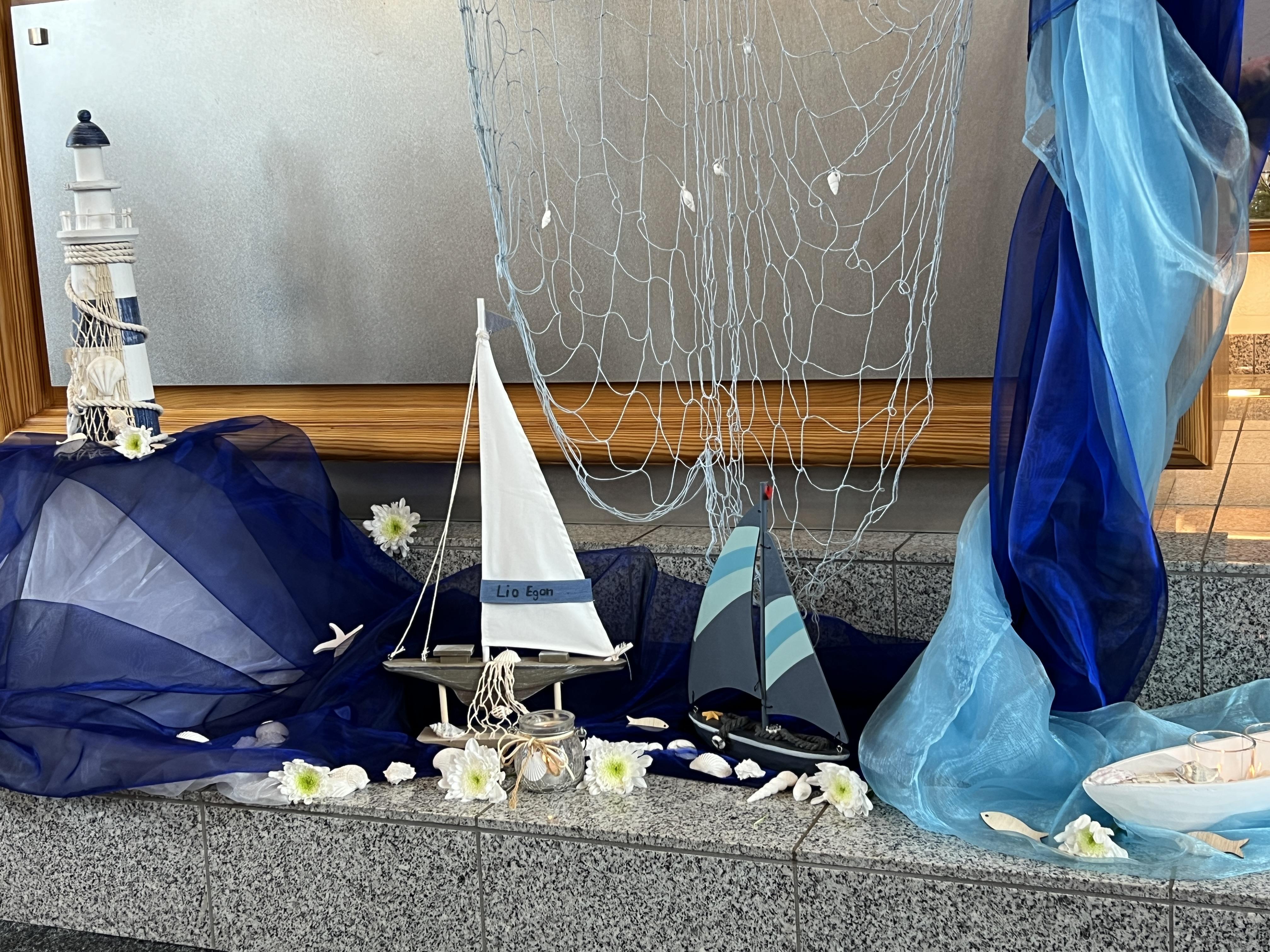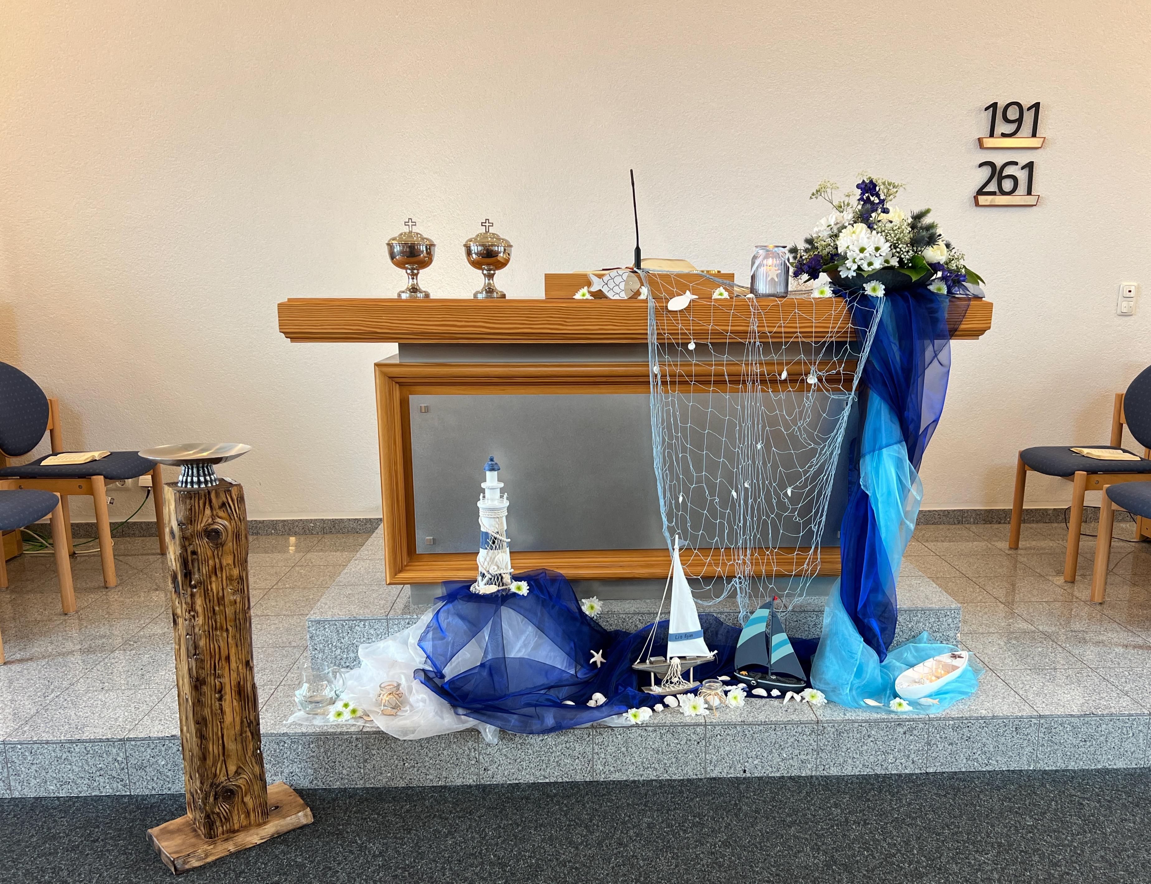 Wir sitzen hier im Kirchenschiff. In einigen Kirchen hängen noch Koggen von der Decke. Nachweislich gab es schon Schiffstaufen vor ca. 4000 Jahren in Mesopotamien.