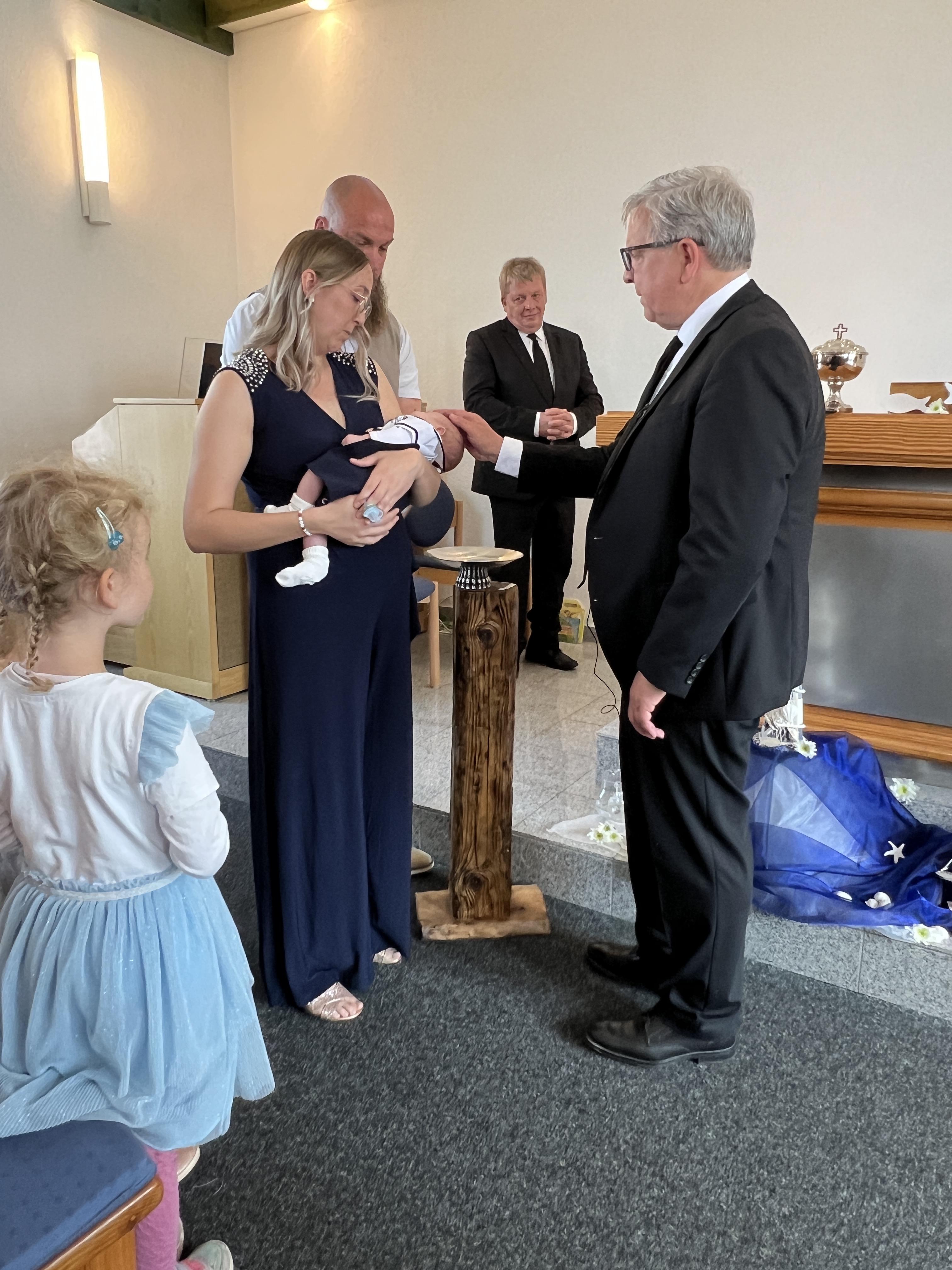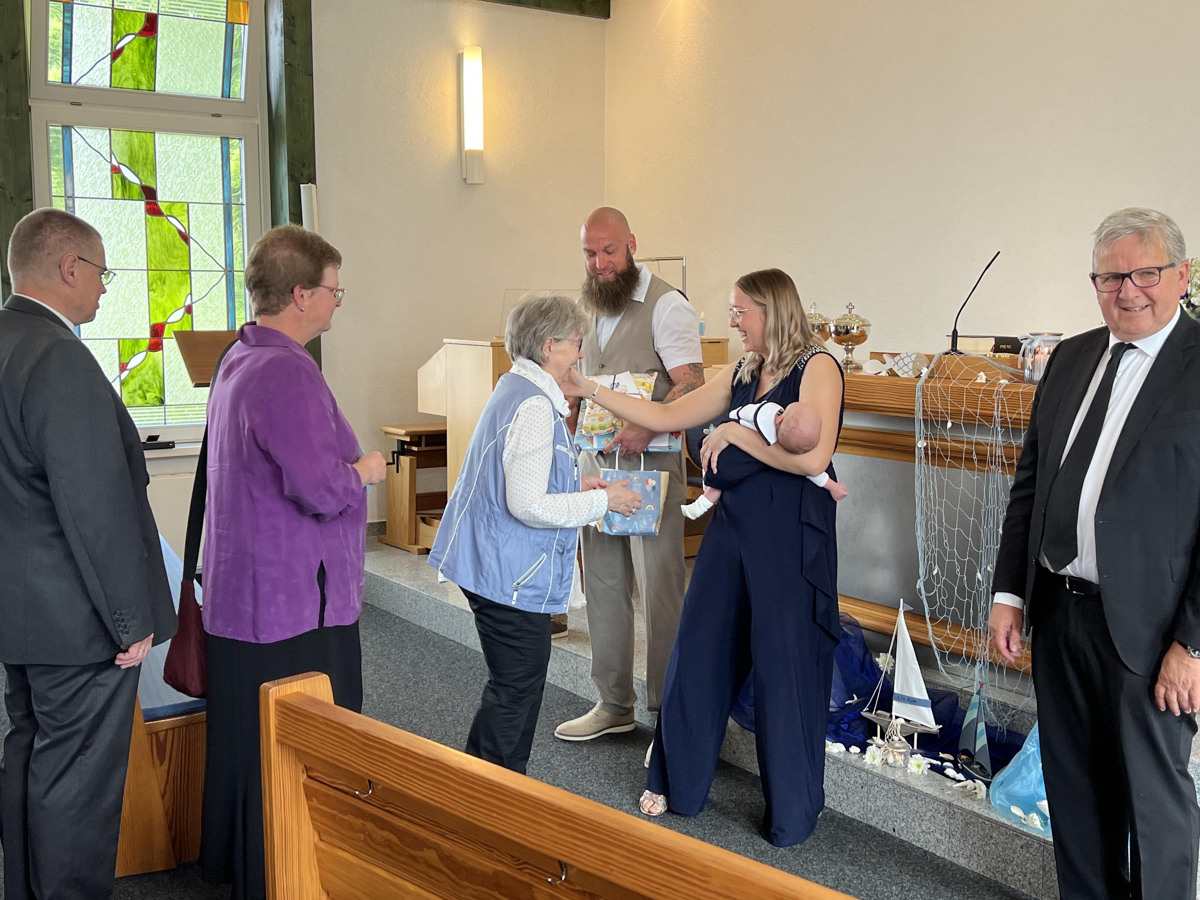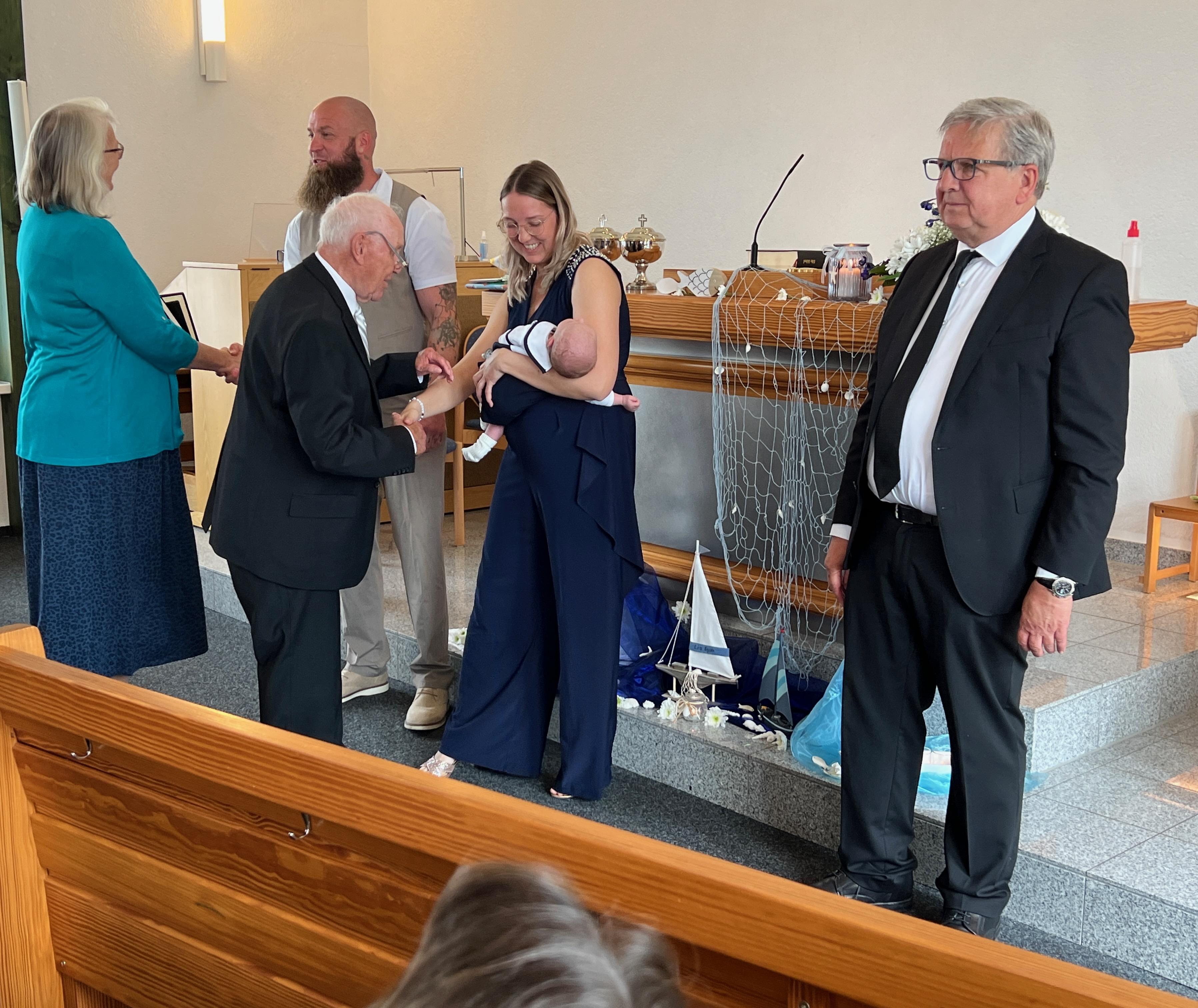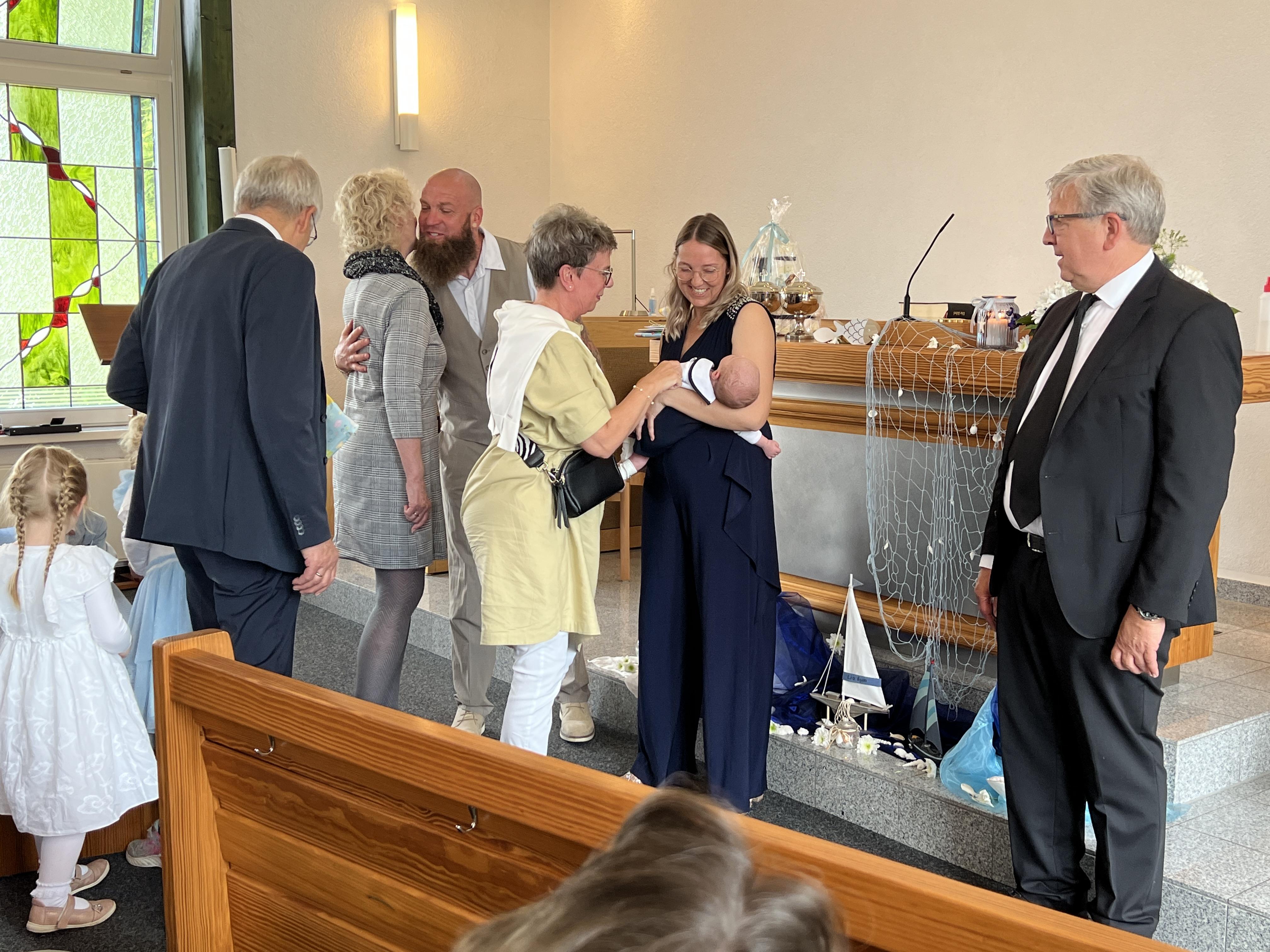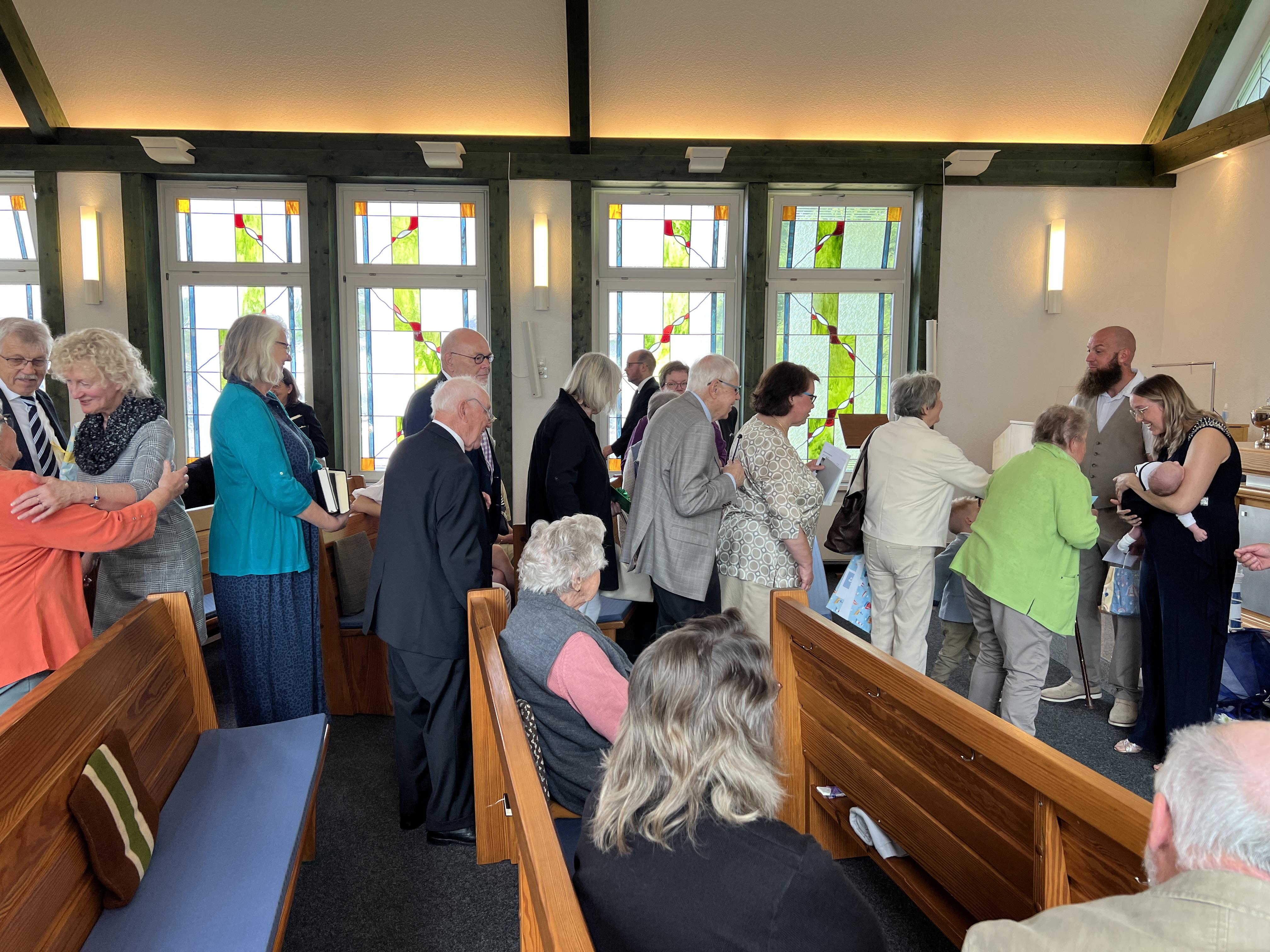 Vor der Sakarmentalhandlung der Heiligen Wassertaufe wurde noch ein Lied von einer Familie vorgetragen, es heißt: „Ich und Du …“ . Danach führte Der Vorsteher die Taufhandlung durch. Anschließend wurde Heiliges Abendmahl gefeiert. Nach Schlussgebet und Segen konnten alle Anwesenden den Eltern und dem kleinen Bruder zur Taufe von Lio gratulieren.