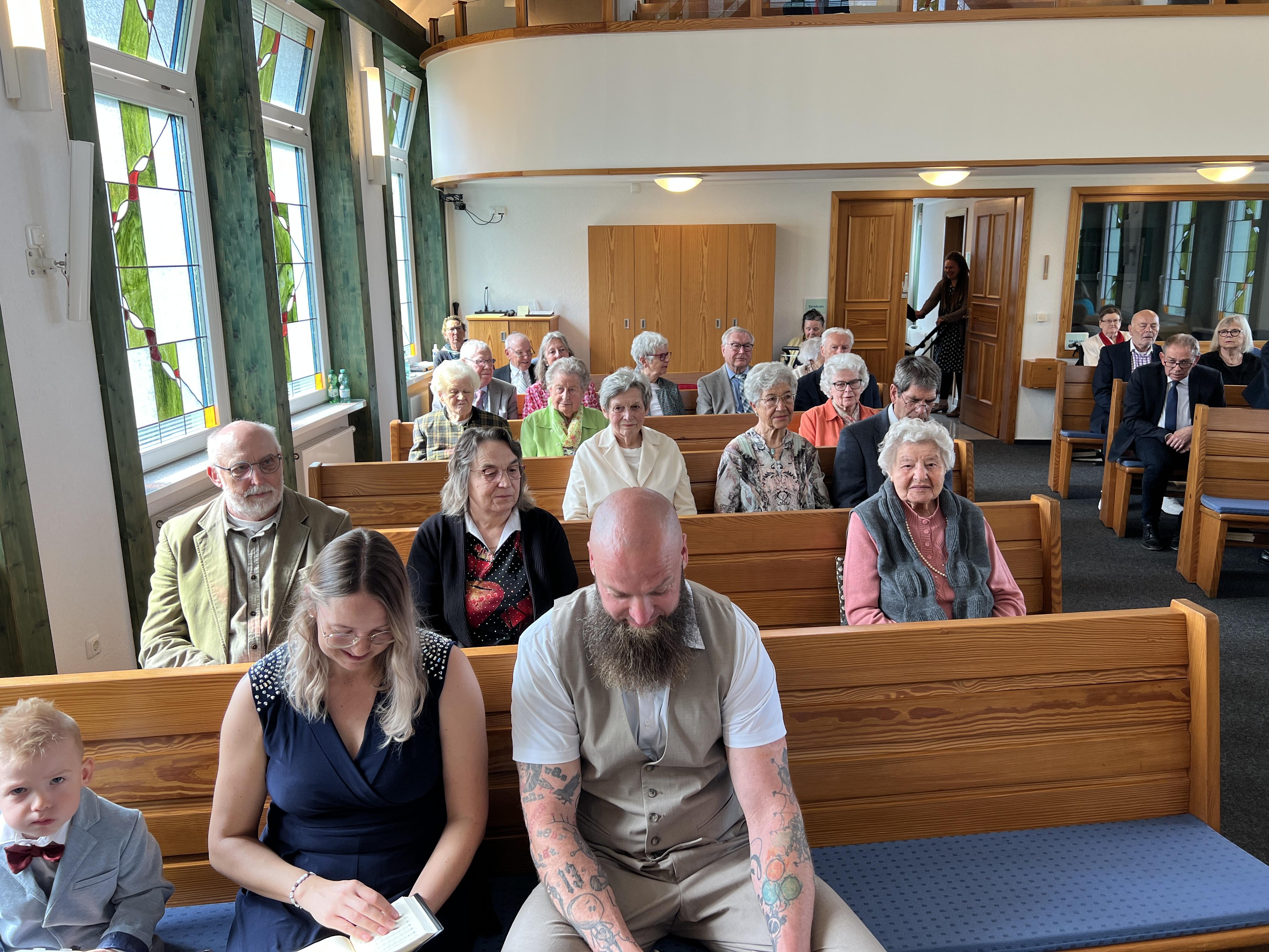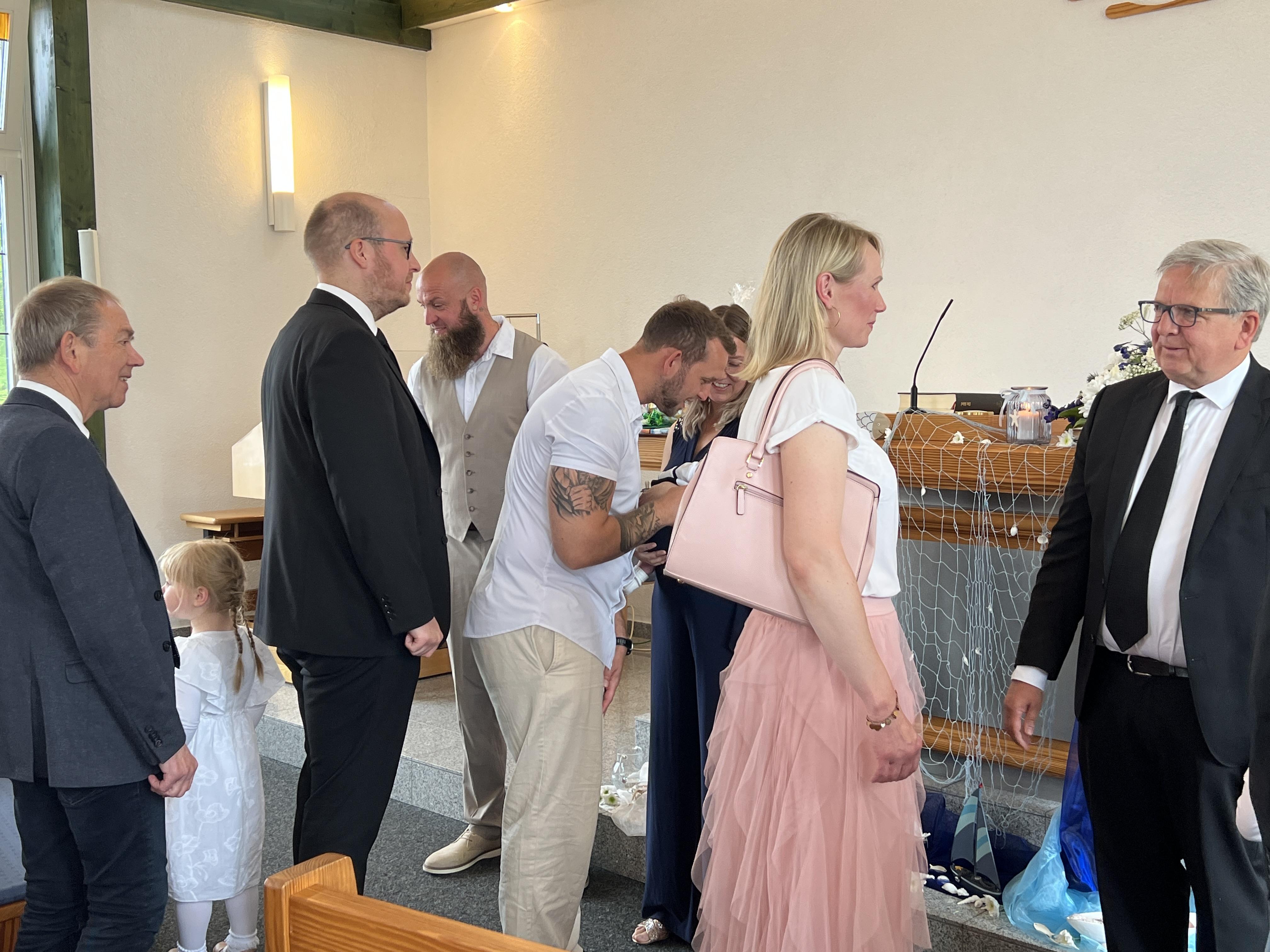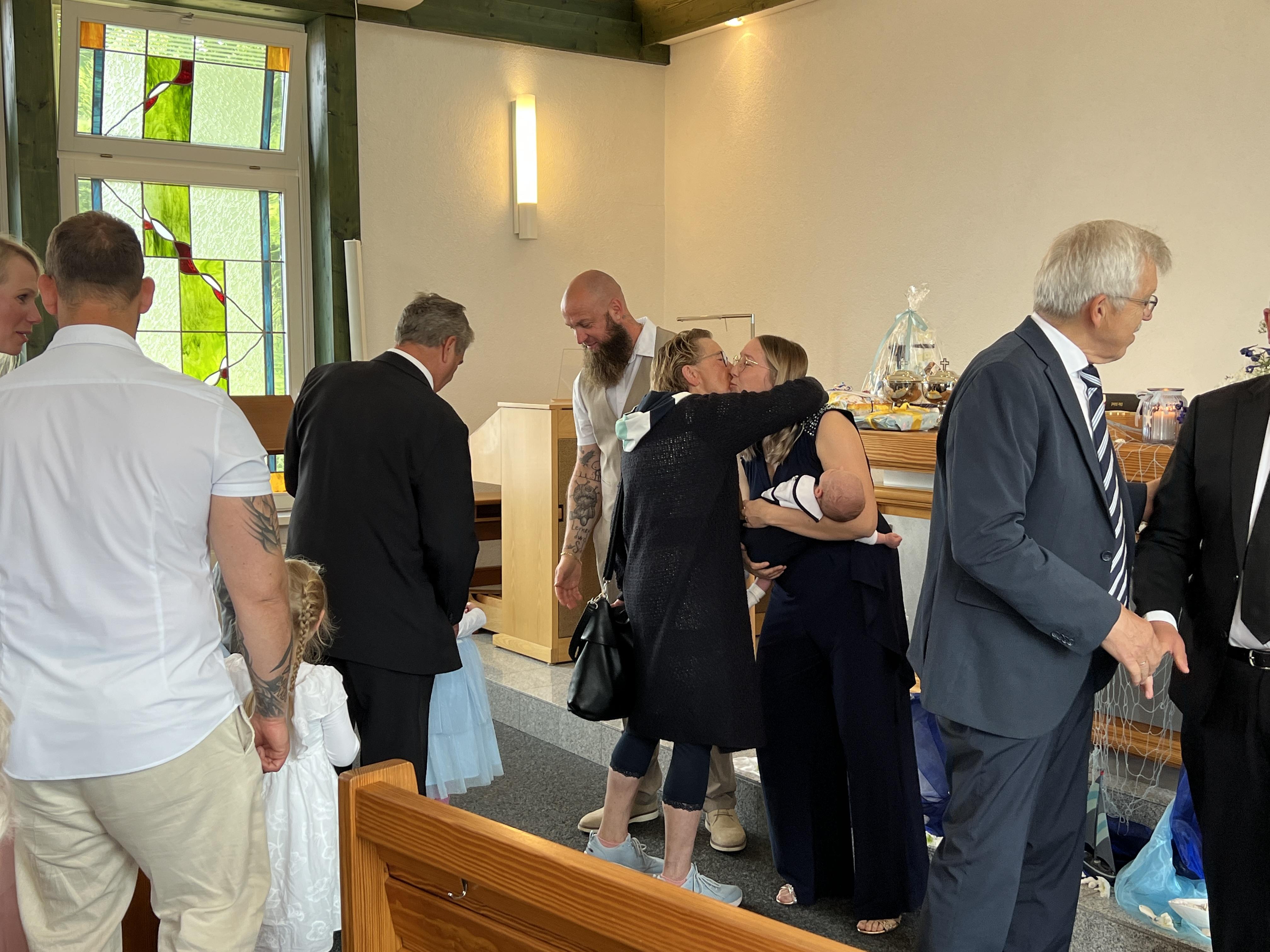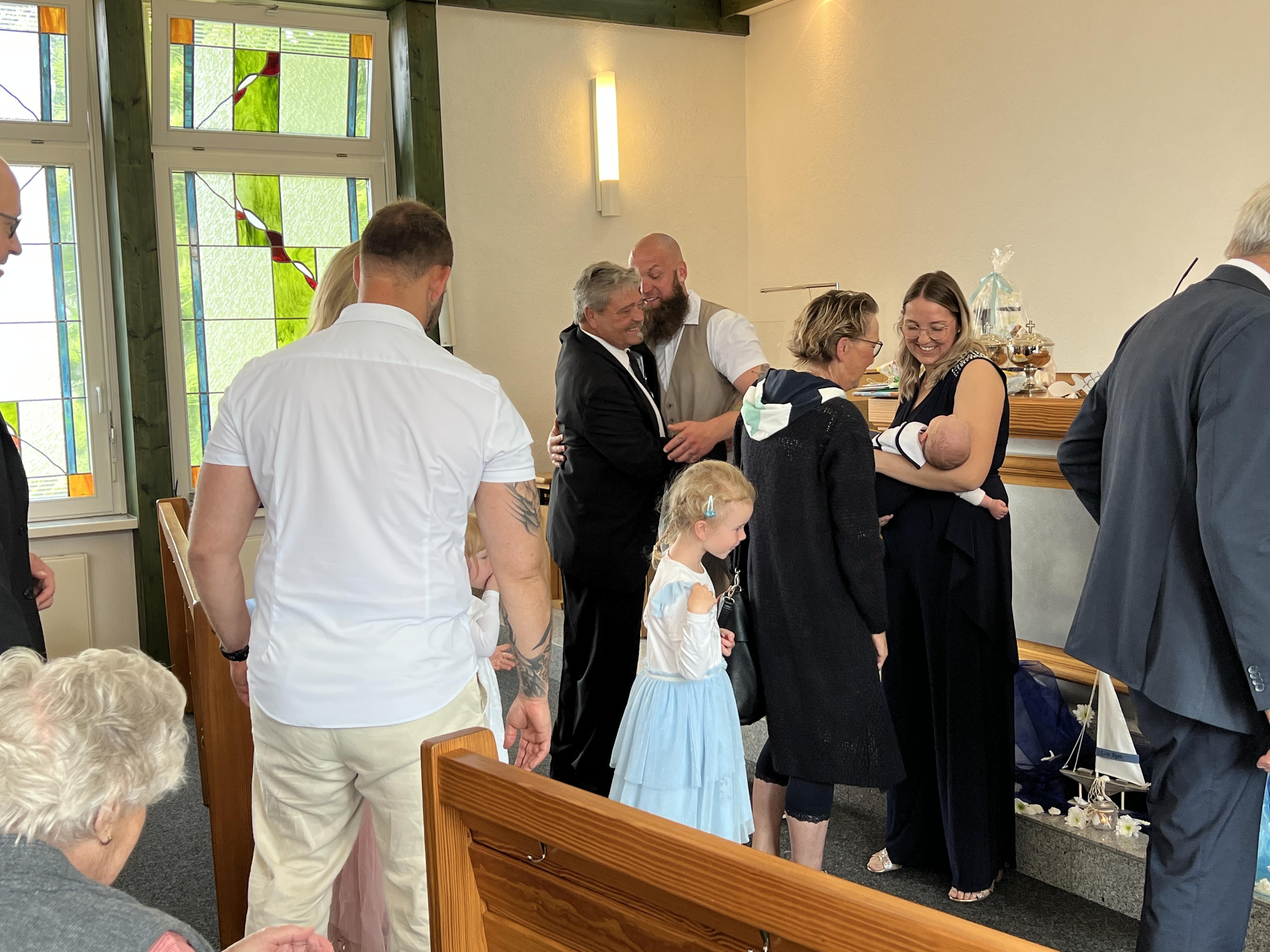 Vor der Sakarmentalhandlung der Heiligen Wassertaufe wurde noch ein Lied von einer Familie vorgetragen, es heißt: „Ich und Du …“ . Danach führte Der Vorsteher die Taufhandlung durch. Anschließend wurde Heiliges Abendmahl gefeiert. Nach Schlussgebet und Segen konnten alle Anwesenden den Eltern und dem kleinen Bruder zur Taufe von Lio gratulieren.