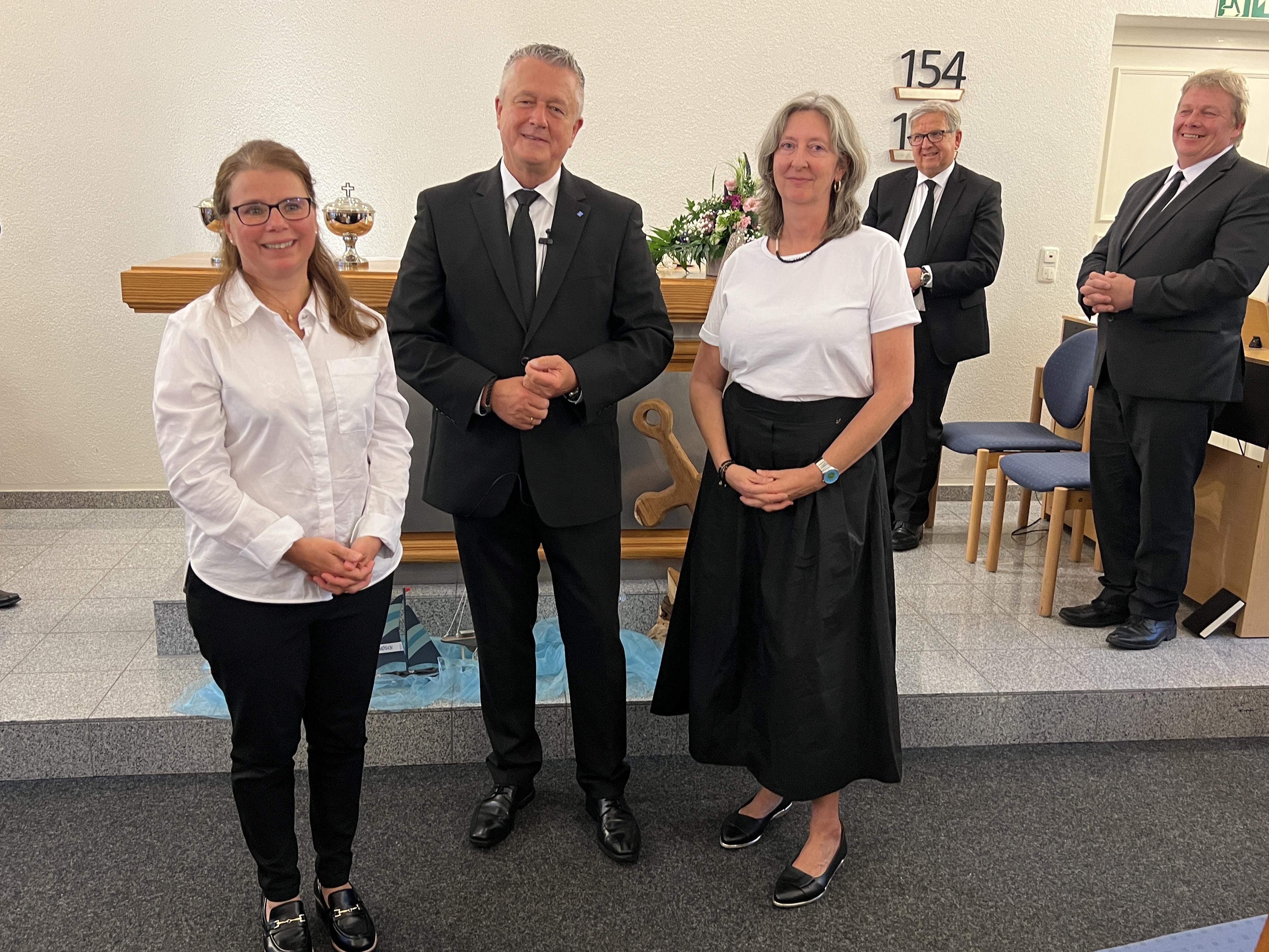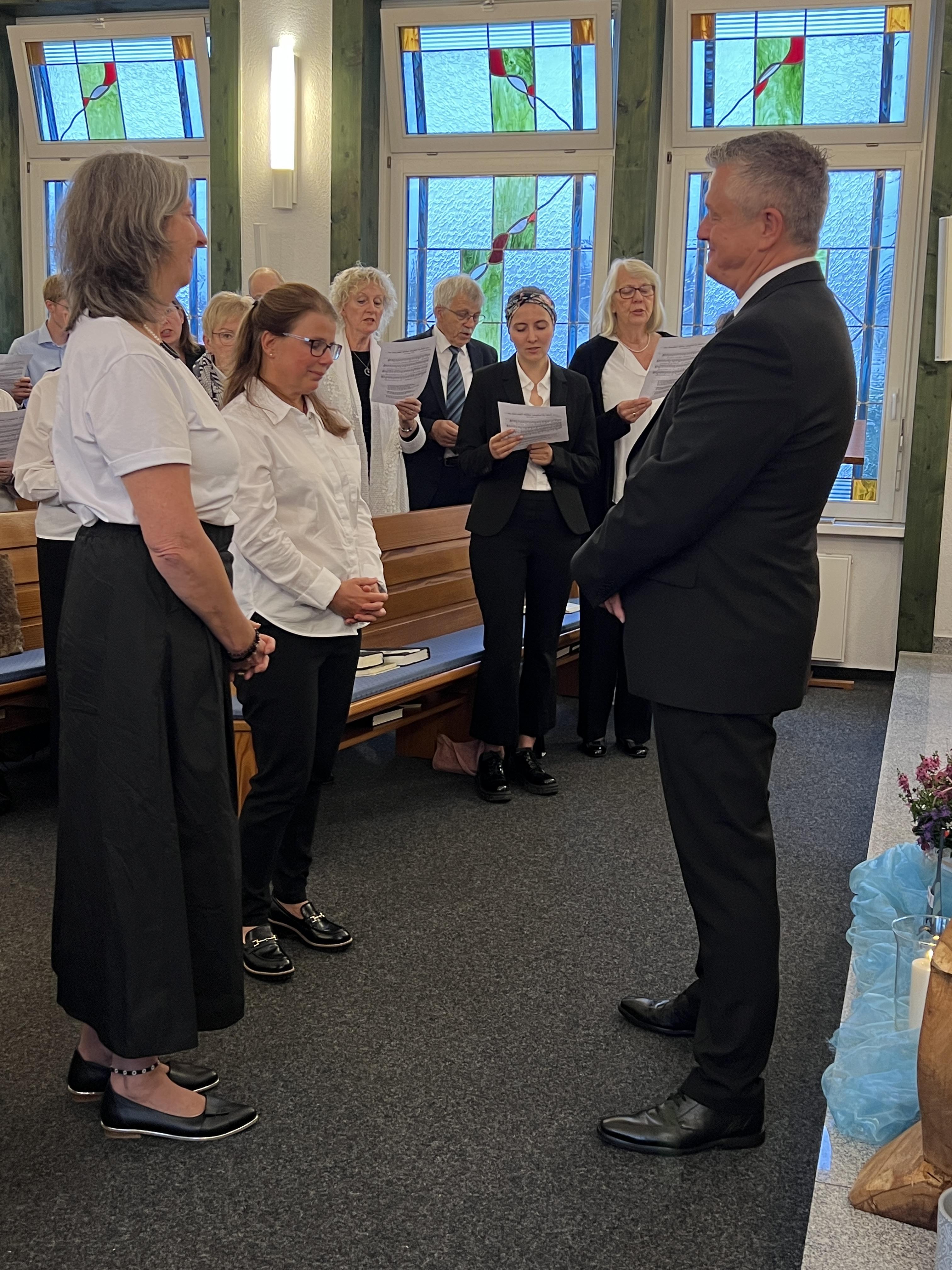 Nach der Feier des Heiligen Abendmahls erfolgte die Überraschung unseres Apostels für unsere Gemeinde: er rief unsere beiden Schwestern Anja Koy und Nadja Weitendorf an den Altar und ordinierte sie zu Diakoninnen. Auch dazu erfolgte das zuvor eingeübte Lied, wieder von Dirk Pfau: „Ich bin bei euch alle Tage, ich bei bei euch, keine Frage. Bis an der Welt Ende.“