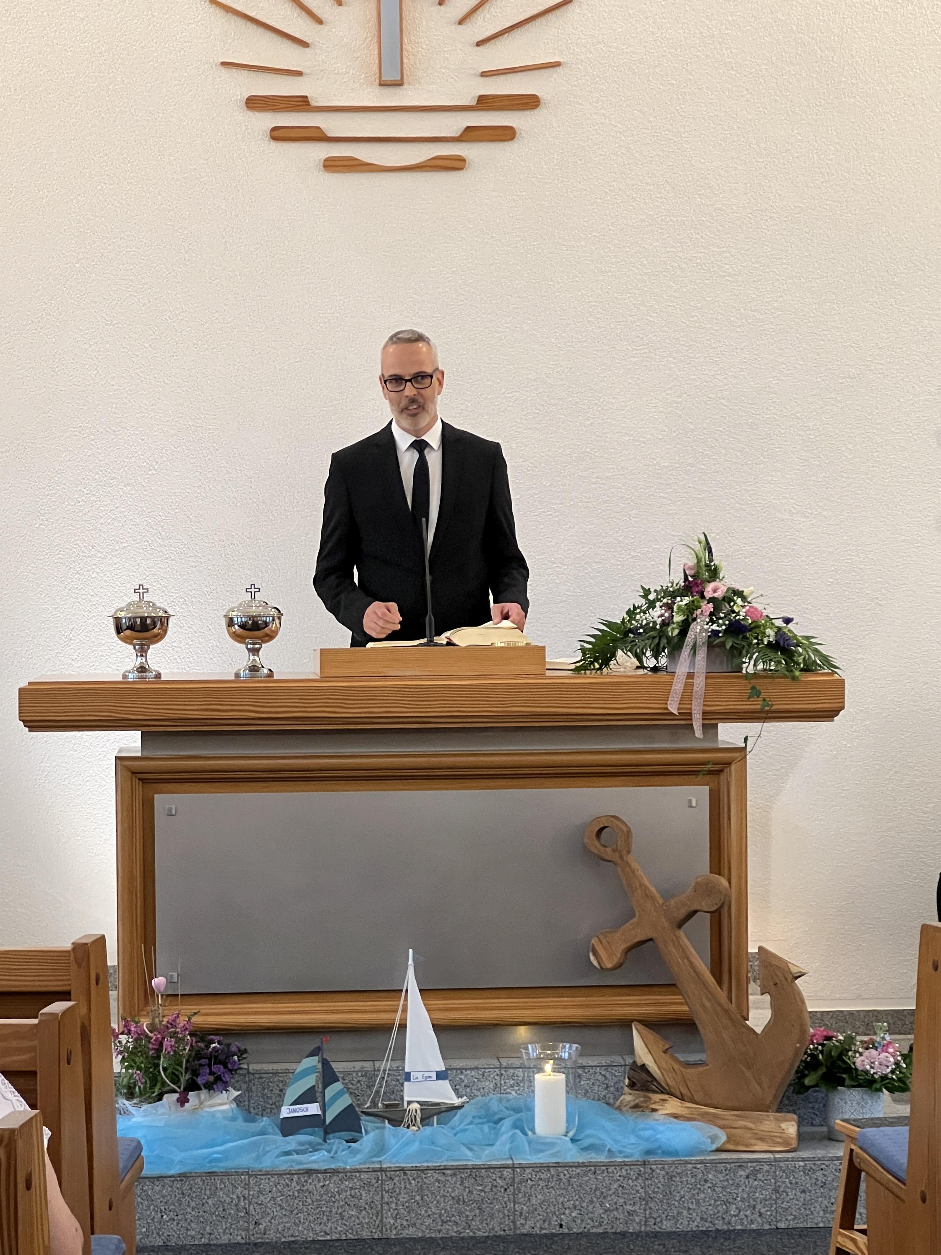 Vor Beginn des Gottesdienstes (GD) hat unser Musikleiter, Priester Thorsten Koy, mit der Gemeinde zwei Lieder eingeübt, die einmal zur Versiegelung (Spende des Heiligen Geistes) und einmal zur Ordination der Diakoninnen gesungen werden sollen.