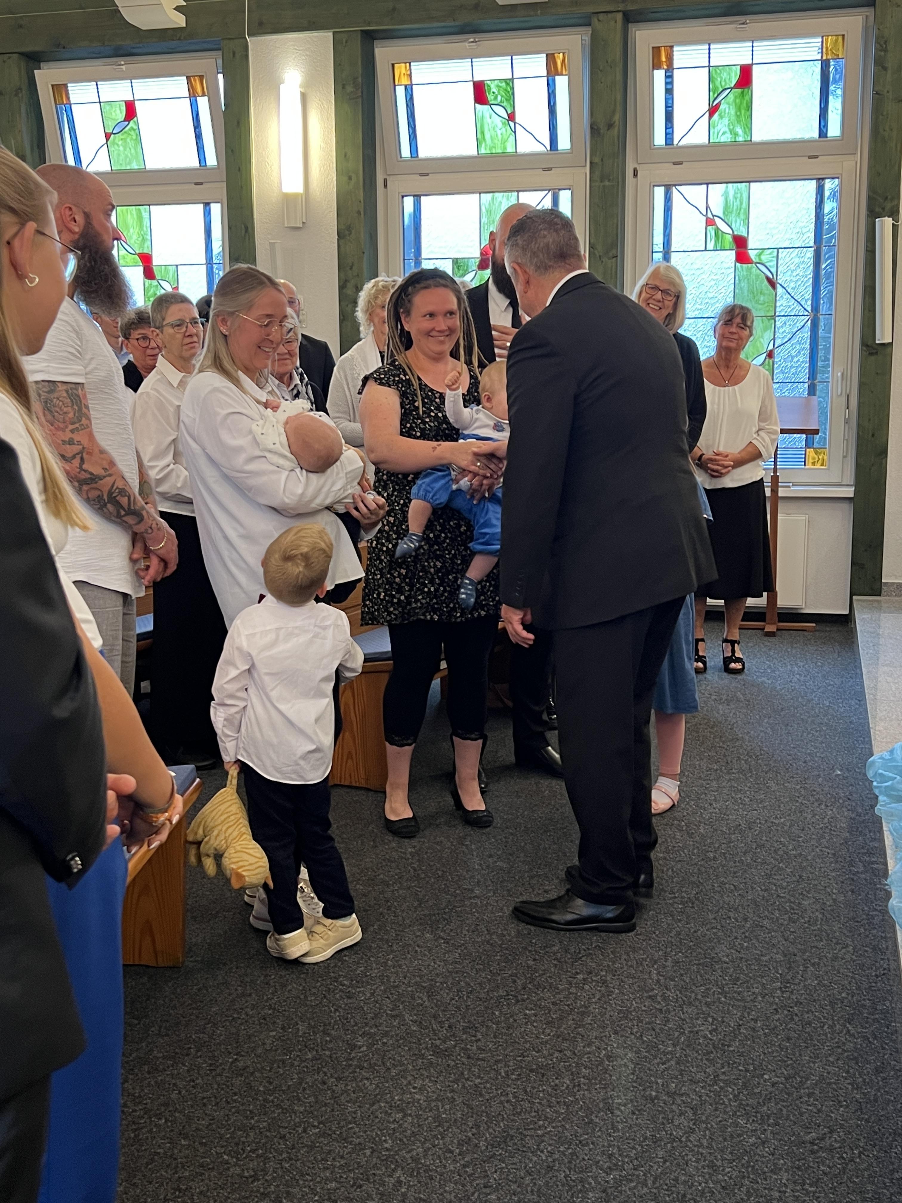 Vor Beginn des Heiligen Abendmahles haben die Eltern mit ihren Kindern die Babys vor den Altar Gottes getragen, damit der Apostel ihnen den Heiligen Geist spenden kann. Dazu sang die Gemeinde das zuvor eingeübte Lied: „Von allen Seiten umgibst du mich und hältst deine Hand über mir“, von Dirk Pfau (Text und Töne).