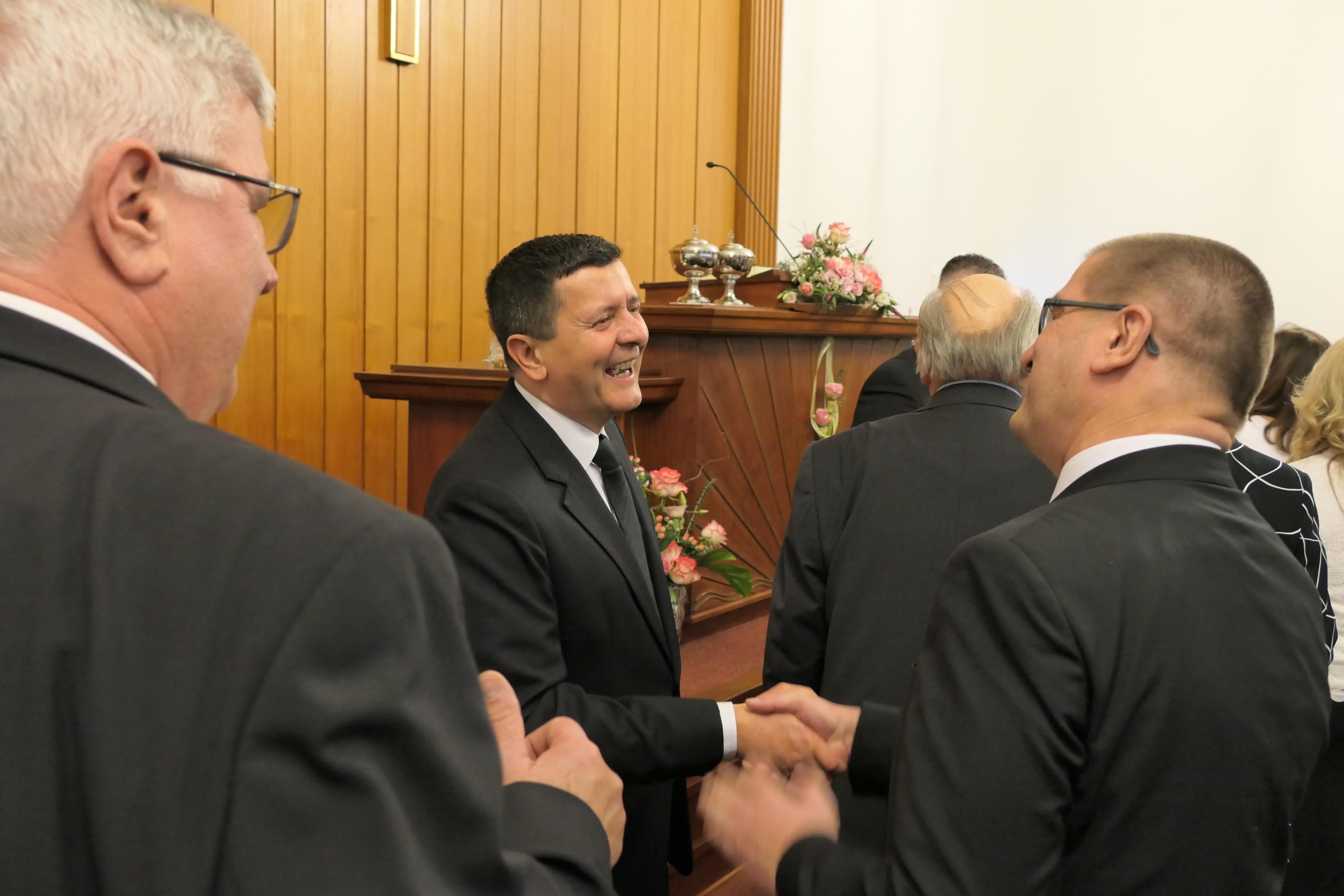 Zur Verabschiedung stellten sich der Bezirksapostel und der „alte“ und der „neue“ Vorsteher vor dem Altar auf. Diese Gelegenheit wurde reichlich genutzt und viele Hände mussten geschüttelt werden.