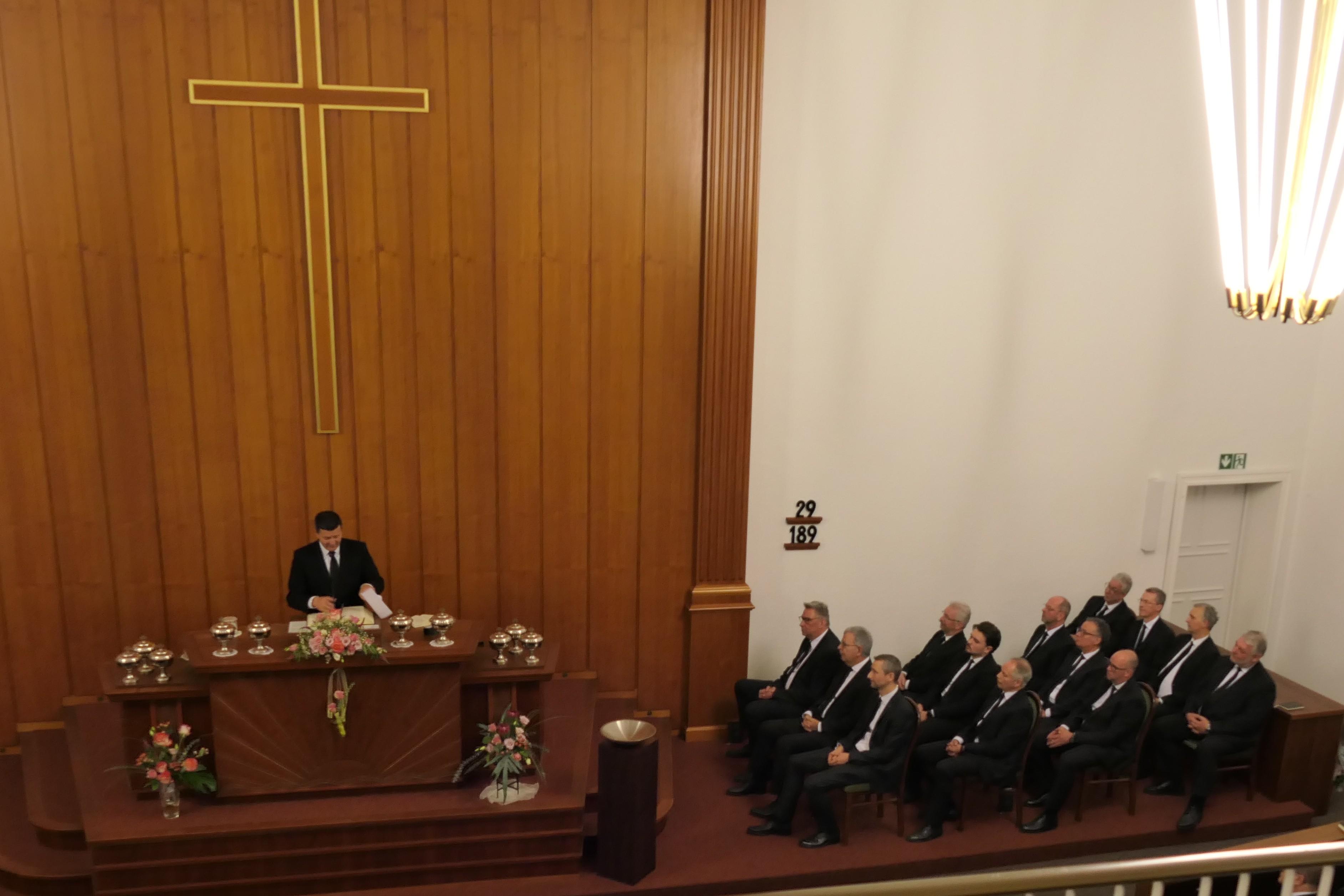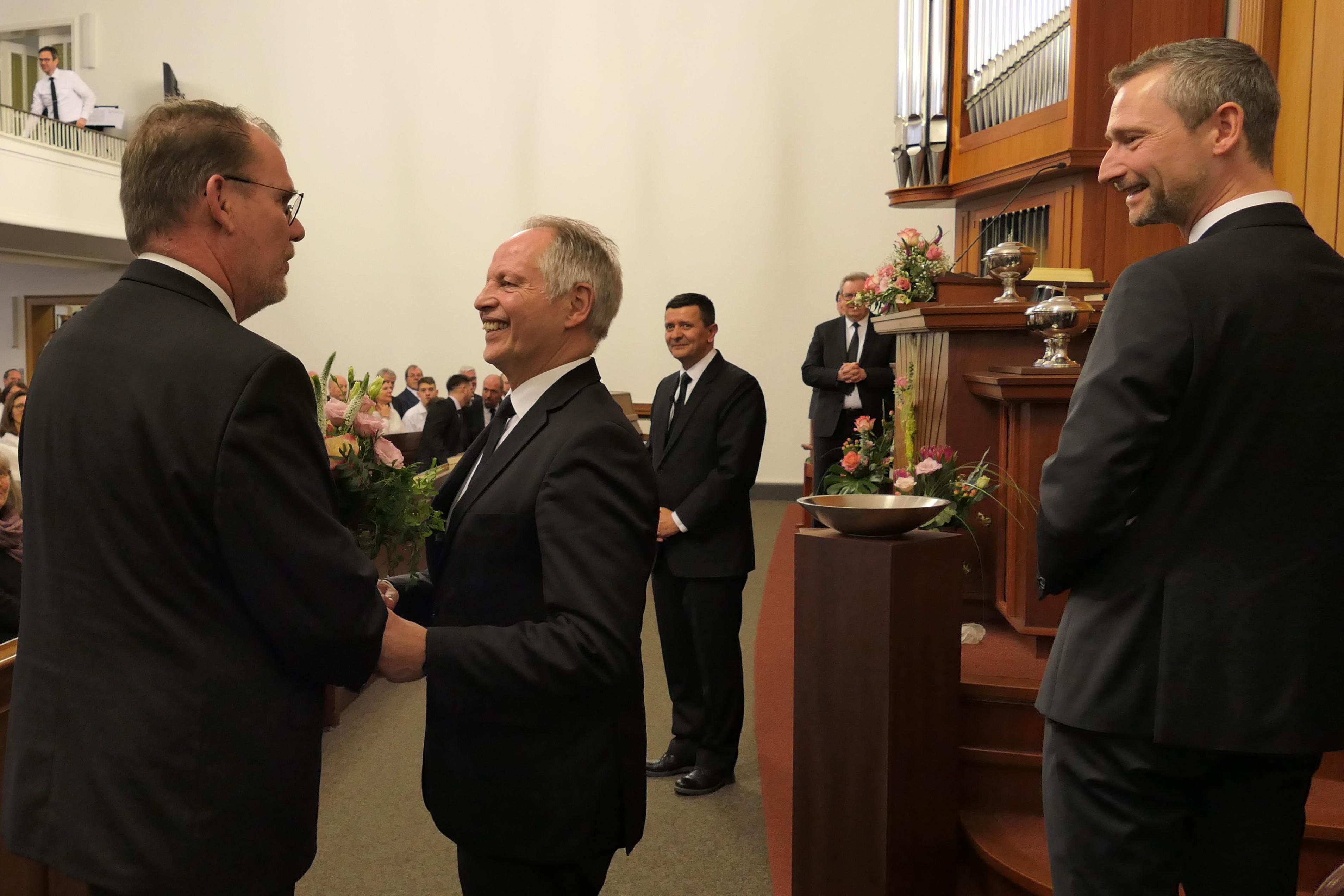 Nach Sündenvergebung und Feier des Heiligen Abendmahles auch für die Entschlafenen im großen Bezirksapostelbereich entband Bezirksapostel Heynes den Hirten Jegminat von dem Auftrag, Vorsteher für die Gemeinde Neumünster zu sein. Er dankte ihm für seine liebevolle Betreuung der Gemeinde. In Schweden hatten die beiden sich schon gut kennengelernt. Da Hirte Jegminat bereits als Jugendlicher schwedische Gemeinden betreut hat, wird er auch jetzt bis auf Weiteres in Schweden dienen.