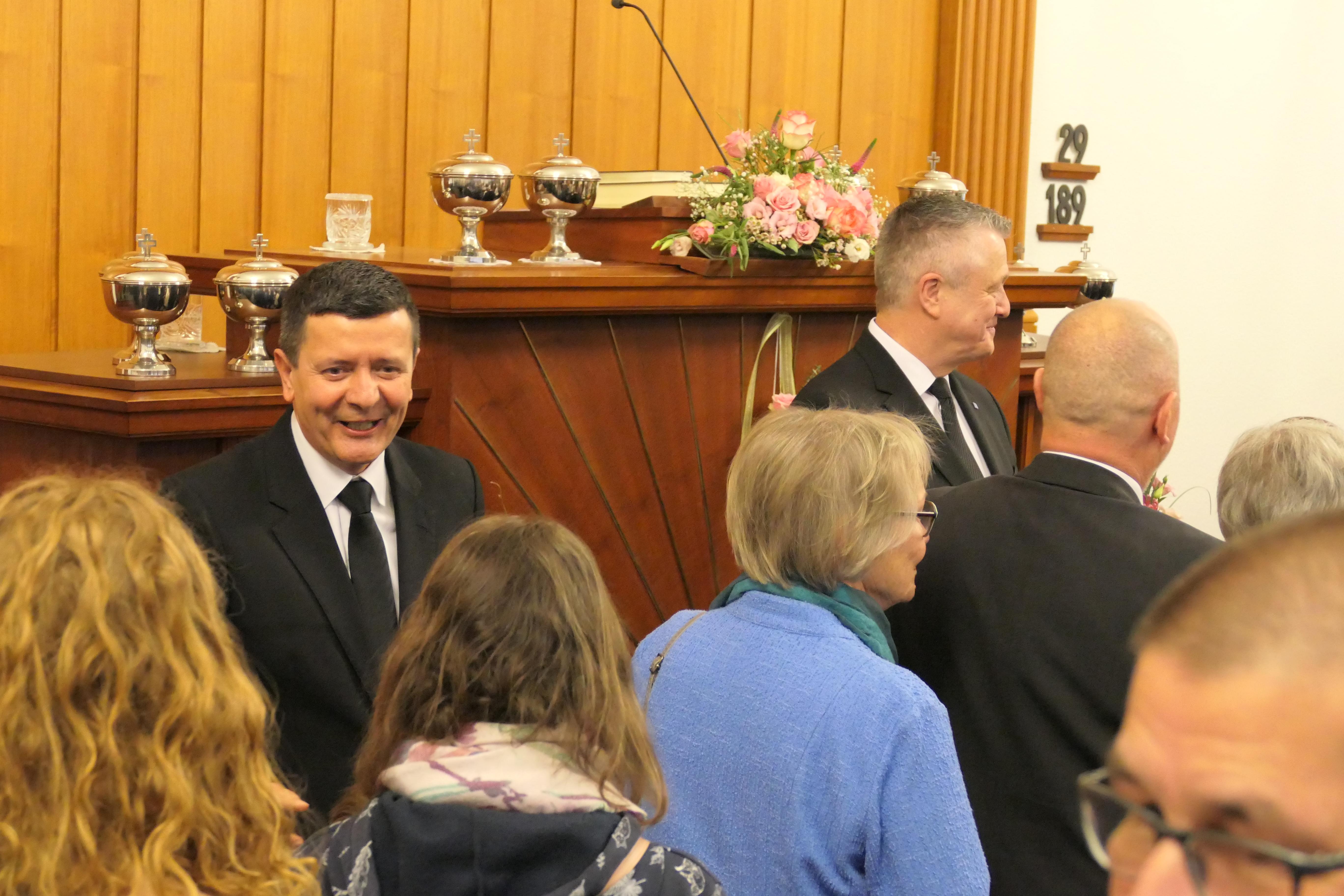 Zur Verabschiedung stellten sich der Bezirksapostel und der „alte“ und der „neue“ Vorsteher vor dem Altar auf. Diese Gelegenheit wurde reichlich genutzt und viele Hände mussten geschüttelt werden.