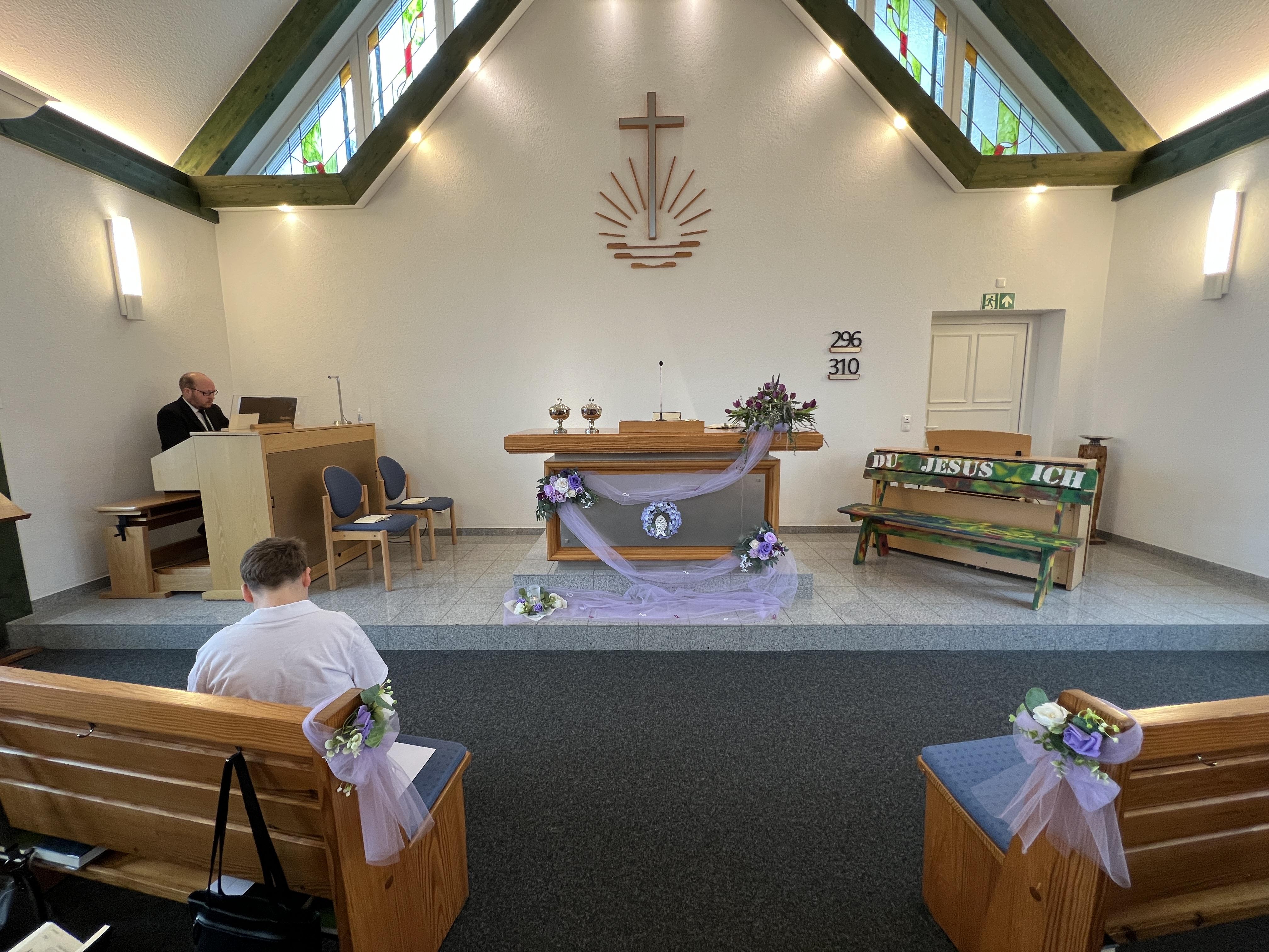 Nach der Predigt sang die Gemeinde aus dem Gesangbuch das Lied, Nr 238: „Jetzt, in unsren Jugentagen…“. Dort heißt es u. a. im 2. Vers: „… Gutes tun und Liebe üben, gern befolgen seinen Rat! Und im Refrain: „Dir, Herr Jesus Christ, zu dienen, deiner Sache zugetan, ist für uns des Lebens Sonne, ist uns Mitte, Ziel und Bahn.“