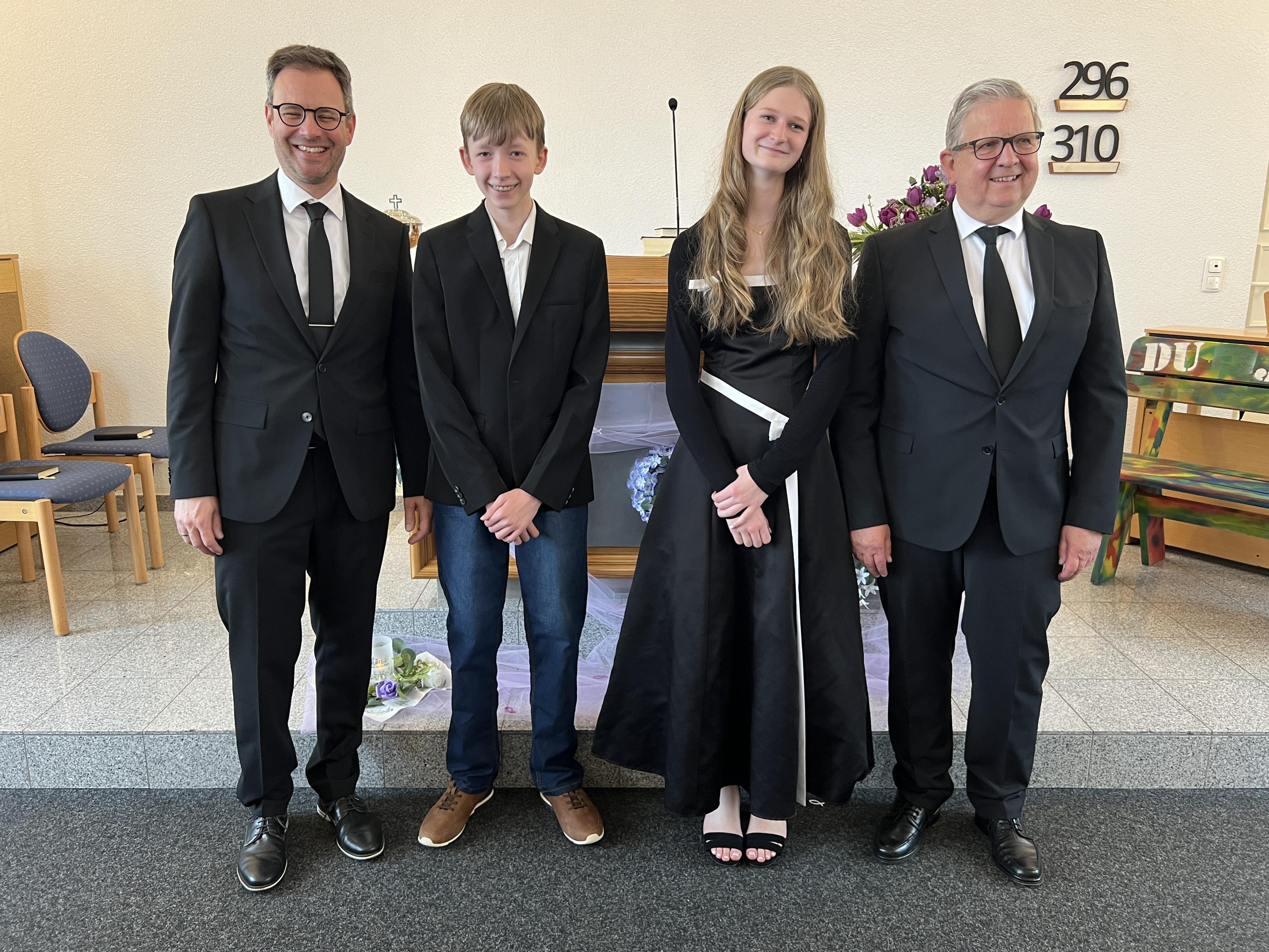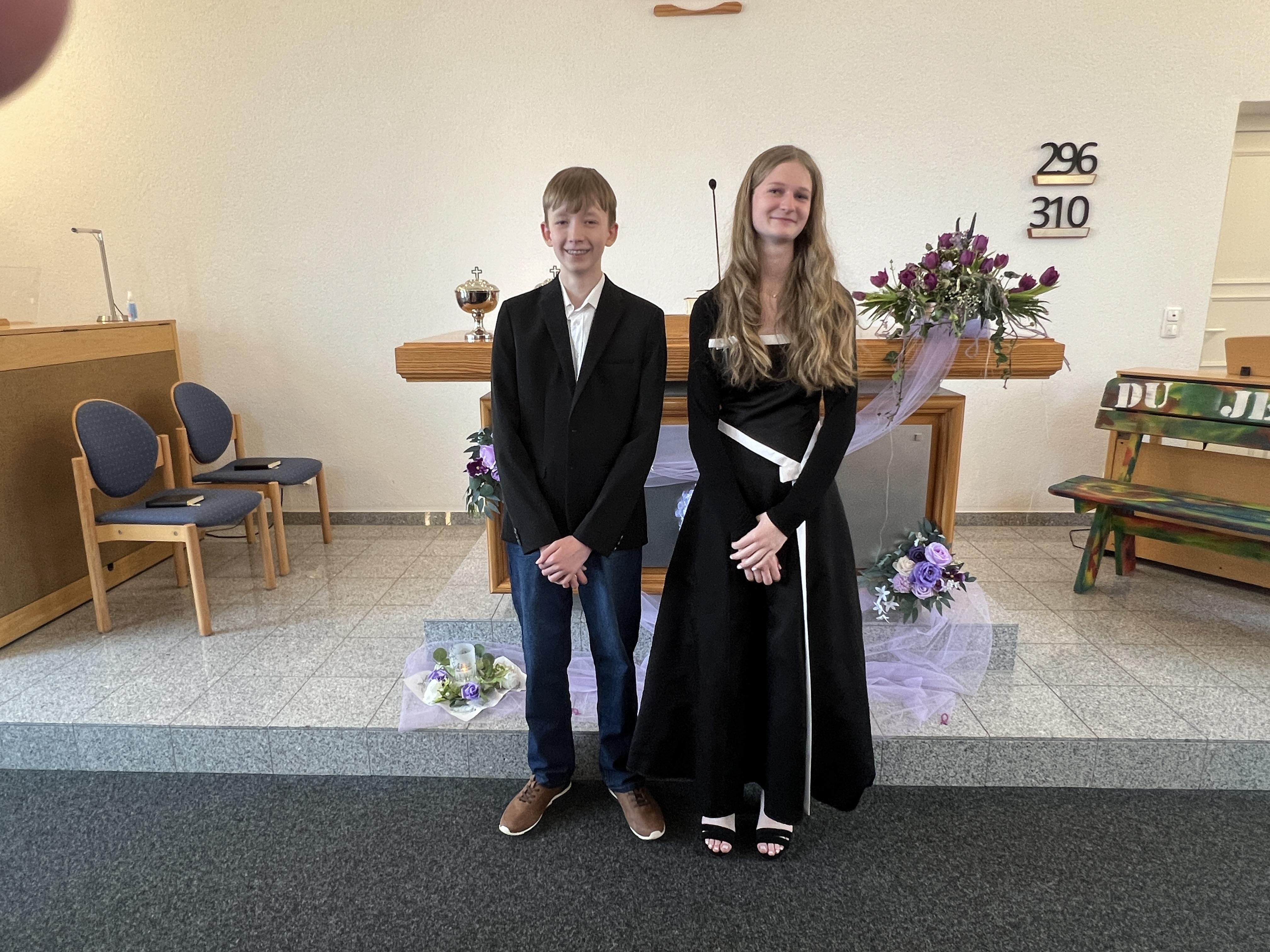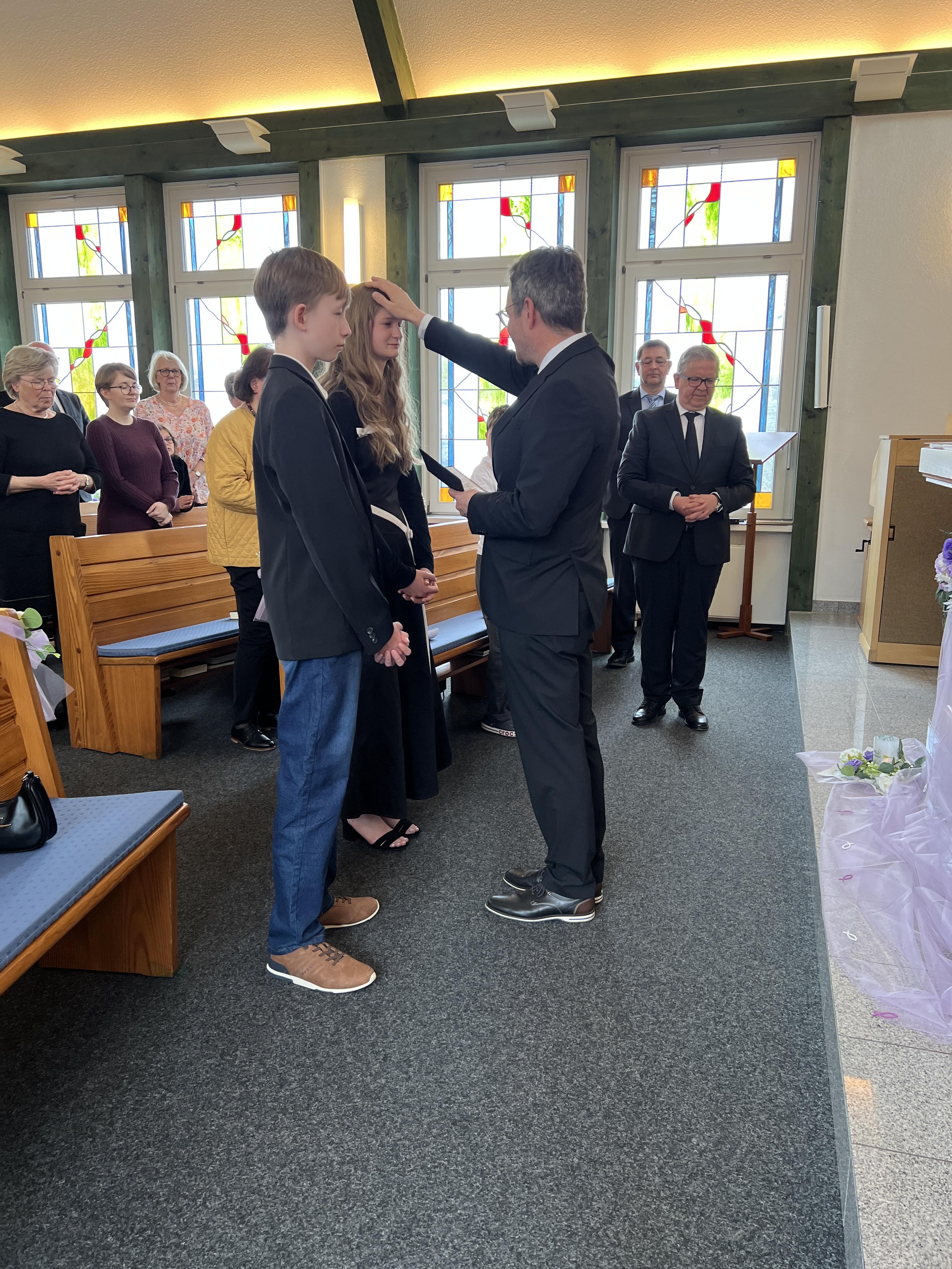 Nach der Sündenvergeung, und zur Einstimmung der Segenshandlung zur Konfirmation, trug der Chor das Lied aus der CM, Nr 328 vor: "Gottes Liebe, Gottes Gnad hat herrlich dich geführet, ... und weiter: Jesus nahm in heil´ger Stund dein Treugelöbnis hin, gab dir seine Liebe kund und schmückte Herrz und Sinn". Währenddessen traten Alberta und Lukas vor den Altar und Priester Koy hielt nach dem Chorlied die Konfirmationansprache. In seiner Ansprache hat er unter anderem den Konfirmationsbrief vom Stammapostel der Gemeinde vorgelesen. Danach sprachen beide das Konfirmationsgelöbnis mit den Worten: " Ich entsage dem Teufel und all seinem Werk und Wesen. Und übergebe mich dir, Vater, Sohn und Heiliger Geist, im Glauben, Gehorsam und ernstlichem Vorsatz, dir treu zu sein, bis an mein Ende. Amen". Jetzt erfolgte der Segen Gottes durch Handauflegung von Priester Koy. Anschließend hat die Gemeinde das Heilige Abendmahl gefeiert. Danach wurde das Schlussgebet gesprochen und der dreifache Segen Gottes gespendet, mit den Worten: „Die Gnade unseres Herrn Jesus Christus und die Liebe Gottes und die Gemeinschaft des Heiligen Geistes sei mit euch allen! Amen!“