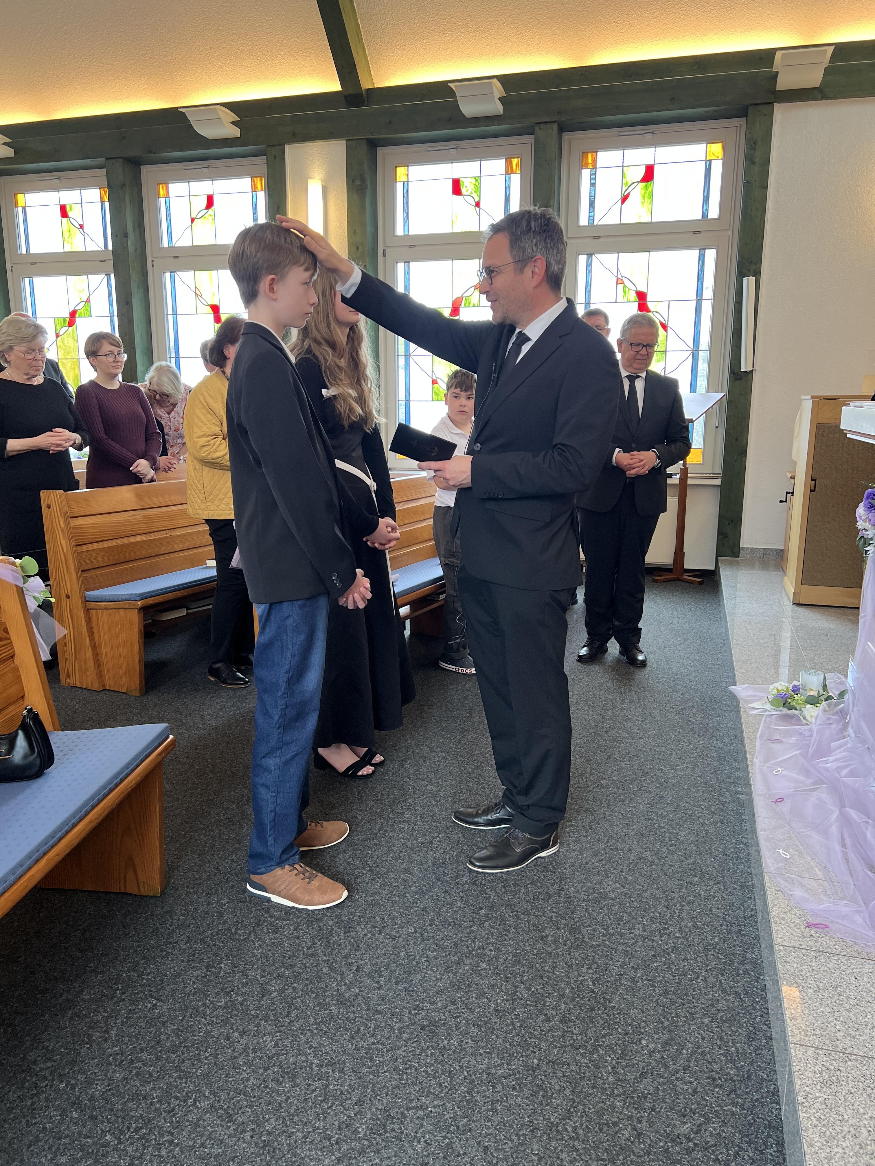 mit Alberta Winkler und Lukas Binder. Bei der Konfirmation übernehmen Heranwachsende vor Gott die Verantwortung für ihr Handeln als Christen. Sie bekennen ihren Glauben zum dreieinigen Gott und bekunden den Willen, ihr Leben nach seinen Maßstäben zu führen. Unter Handauflegung empfangen sie den Segen, der sie in ihrem Bestreben stärken soll.